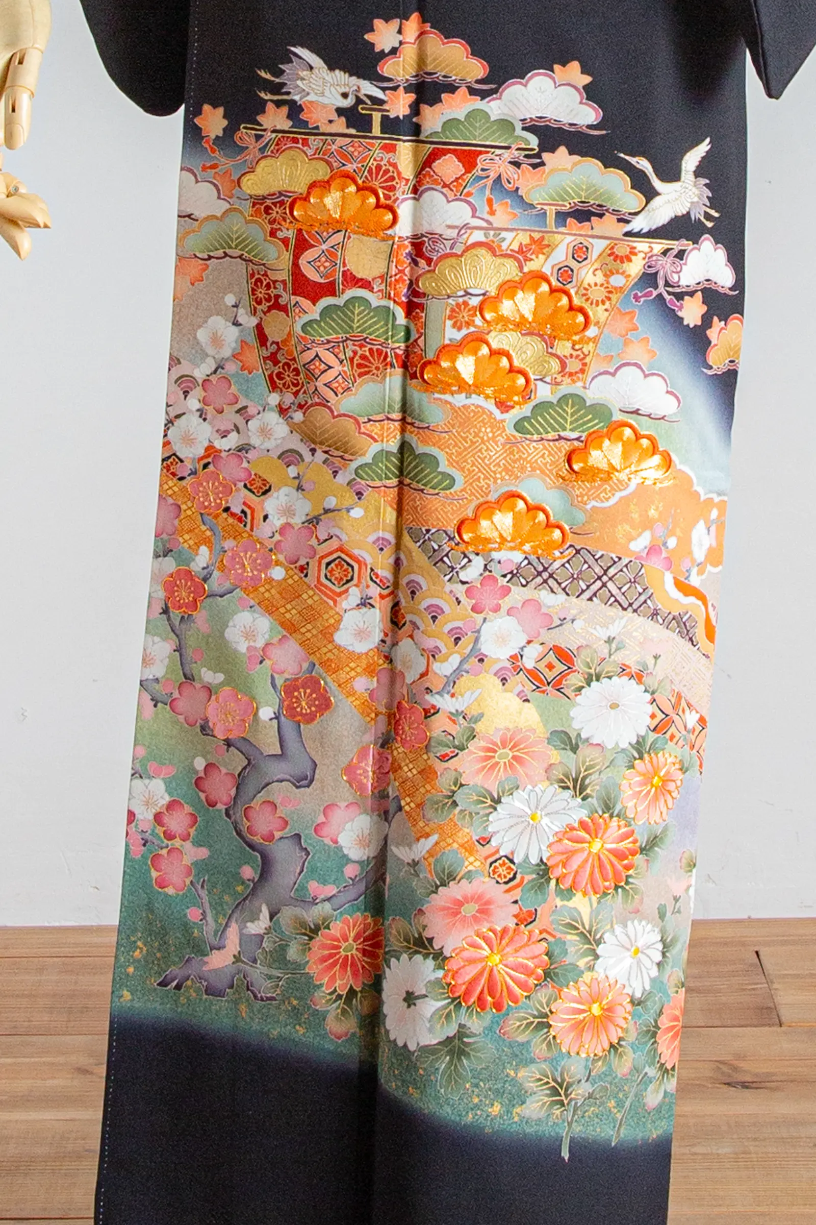 華やかな吉祥花文様が印象的な黒留袖です。格式ある黒地に、花々のやさしい彩りと金彩が美しく映え、ご家族での結婚式や会食、フォトウェディングの親族衣装として上品にお召しいただけます。落ち着きの中にも華やかさがあり、お母様の装いを品よく引き立てる一着です。