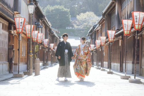 ひがし茶屋街の特徴的な雰囲気は、フォトウェディングとの相性が抜群です。伝統的な建築や風情ある街並みは、和装のフォトウェディングの雰囲気を一層引き立てます。