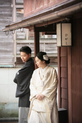 ひがし茶屋街の美しい背景と和装の衣装が調和すると、素晴らしい写真が撮影できます。白無垢、色打掛、どちらのスタイルにもマッチする風景が魅力的です。