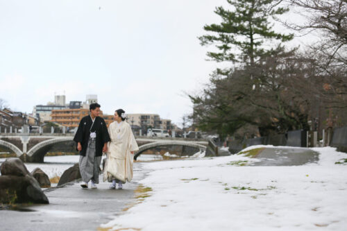 風情のある街並みを、浅野川に架かる美しい橋の上を、または川沿いを、新郎新婦が手をつないで歩くポーズは、風景との一体感を演出できます。街並みや橋や川の流れを背景に、自然な笑顔でお互いを見つめ合う姿は、幸せな瞬間を感じさせます。