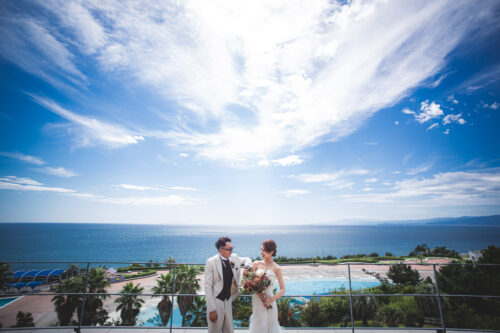 ガラス張りのチャペルの正面には湘南の海。向こうには江ノ島をはじめ、状況によっては伊豆大島なども望むことができる眺望が良いチャペルの撮影が楽しめるスペシャルなプラン。全データ+20ページアルバム付。
